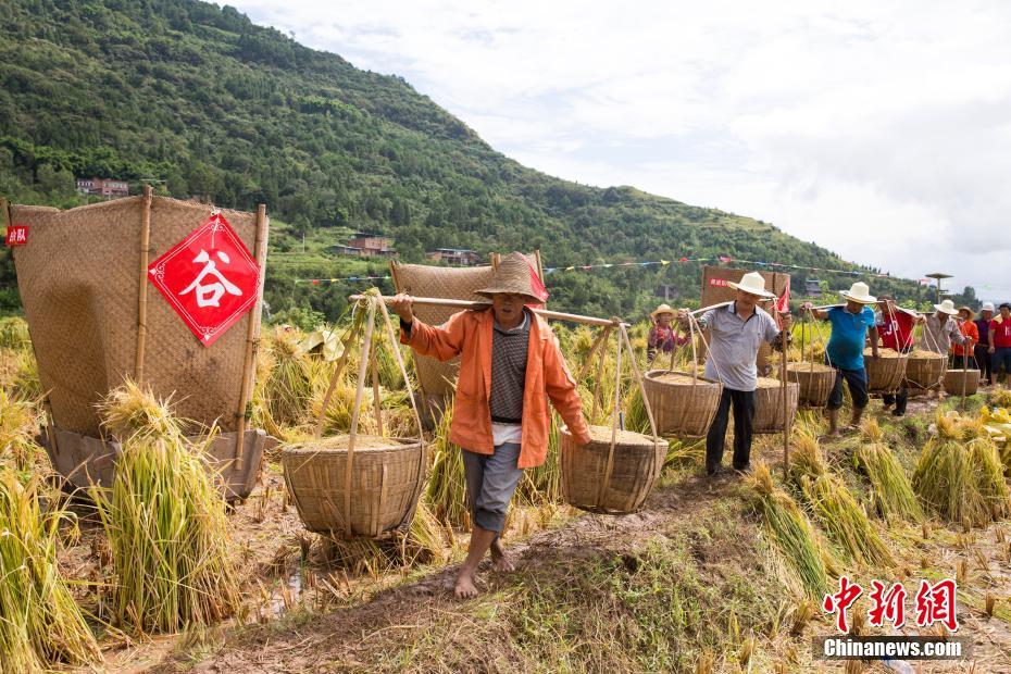 9月23日,2021年中國(guó)農(nóng)民豐收節(jié)·第一屆“天生云陽(yáng)”金秋節(jié)在重慶云陽(yáng)縣鳳鳴鎮(zhèn)拉開(kāi)序幕。時(shí)下正是豐收的季節(jié),三峽庫(kù)區(qū)腹地重慶云陽(yáng)縣的農(nóng)民門(mén)正忙著搶收搶曬,確保水稻玉米等農(nóng)作物顆粒歸倉(cāng)。圖為農(nóng)民喜獲豐收。劉興敏 攝