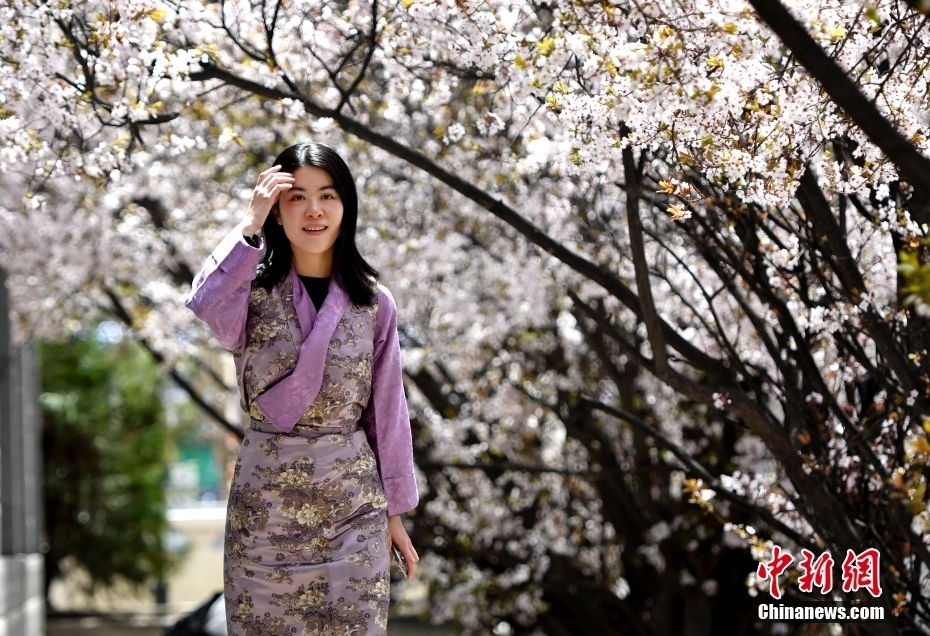 4月1日,市民在春花綻放的道路旁賞花。隨著雪域高原天氣回暖,西藏拉薩市區(qū)各條道路春花綻放。因道路兩側繁華似錦,拉薩市城關區(qū)軍民路成網(wǎng)紅打卡地,市民游客紛紛前來打卡拍照。