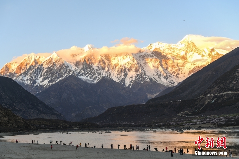 4月1日,西藏林芝市米林市境內(nèi)的南迦巴瓦峰下,桃花盛開,吸引了眾多游客前來游玩。南迦巴瓦峰被譽(yù)為“眾山之父”,海拔7782米,其山頂終年積雪,而山腳下則是郁郁蔥蔥的樹木和盛開的桃花,形成了一幅獨(dú)特的垂直自然景觀。圖為游客在南迦巴瓦峰腳下觀賞“日照金山”。