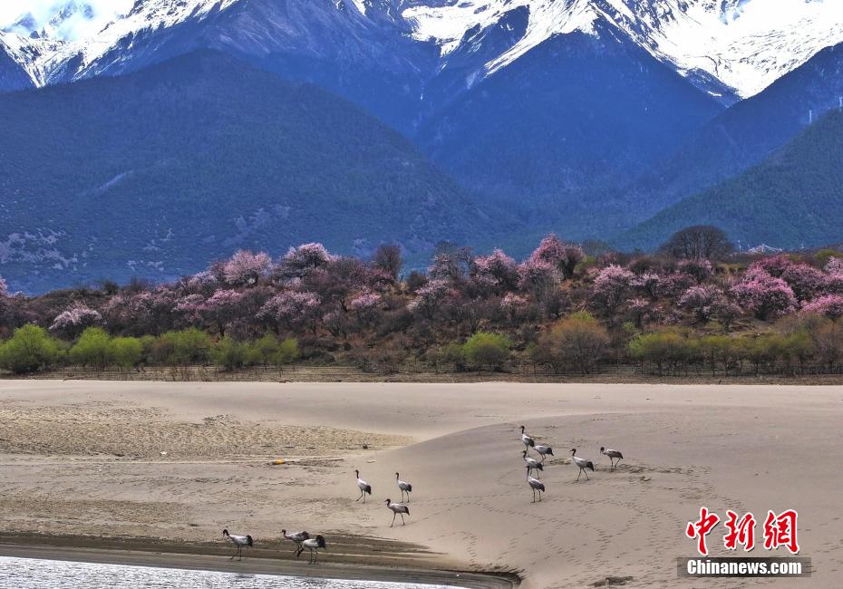 西藏林芝:黑頸鶴與桃花共繪春日畫卷