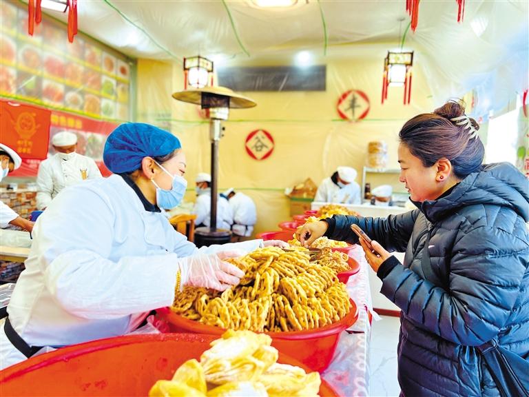 隨著春節(jié)和藏歷新年的臨近,拉薩年貨市場日漸火爆,街頭巷尾飄著陣陣“卡賽”香味?!翱ㄙ悺笔遣貧v新年必備年貨,記者隨機走進一家“卡賽”店,員工們正忙于炸制“卡賽”。市民扎桑說,在家制作“卡賽”費時費力,自己每年都會在市場上購買“卡賽”。