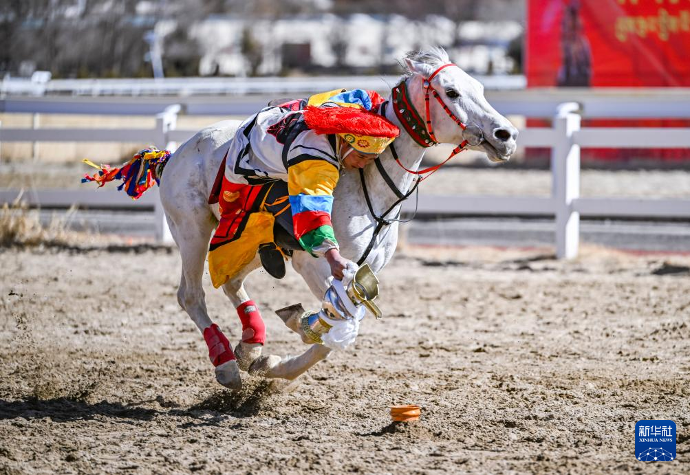 在拉薩賽馬場(chǎng),騎手表演馬上拾哈達(dá)(2月12日攝)。新華社記者 孫非 攝
