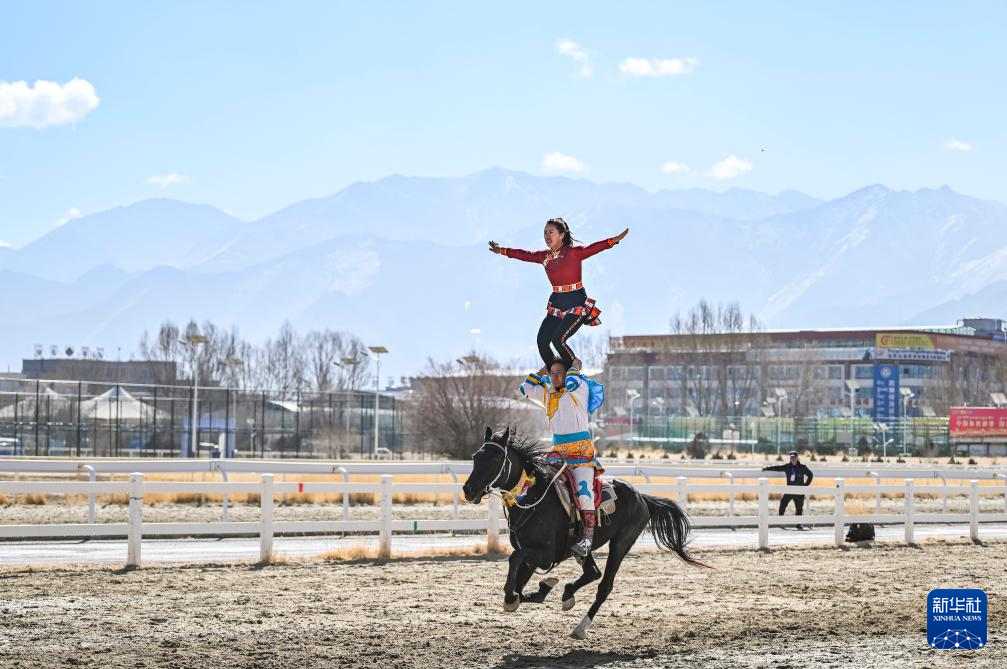 在拉薩賽馬場(chǎng),騎手進(jìn)行單馬雙人表演(2月12日攝)。新華社記者 孫瑞博 攝