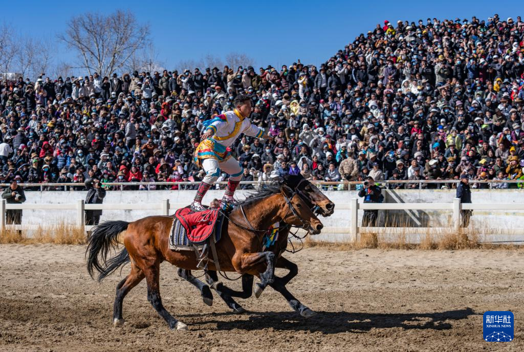 在拉薩賽馬場(chǎng),騎手進(jìn)行雙馬單人表演(2月12日攝)。新華社記者 孫瑞博 攝