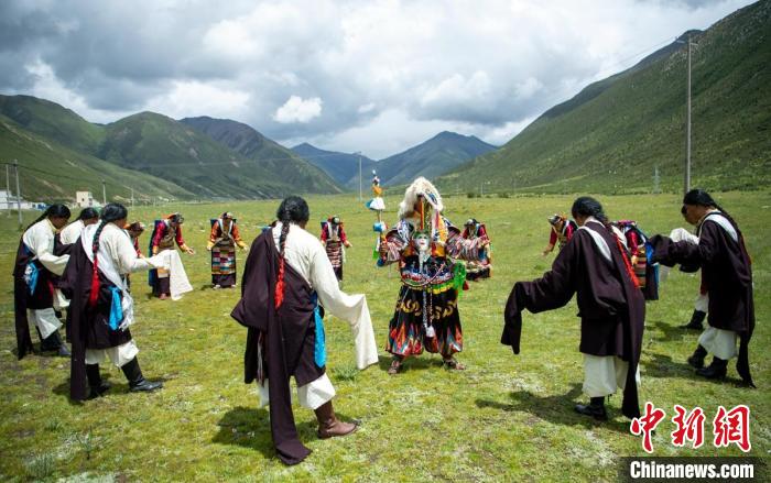 盛夏的西藏自治區(qū)拉薩市墨竹工卡縣門巴鄉(xiāng)仁多崗村草地上,28歲的尼瑪與身著盛裝的藏族牧民們跳著國家級非物質(zhì)文化遺產(chǎn)直孔普堆巴宣舞,迎接遠(yuǎn)道而來的游客,動(dòng)作優(yōu)美的歌舞吸引了大家駐足觀賞,并用手機(jī)或相機(jī)記錄。