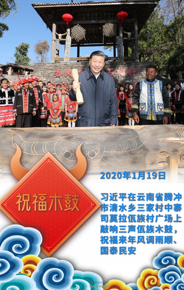 習(xí)近平在云南省騰沖市清水鄉(xiāng)三家村中寨司莫拉佤族村廣場(chǎng)上敲響三聲佤族木鼓,祝福來(lái)年風(fēng)調(diào)雨順、國(guó)泰民安