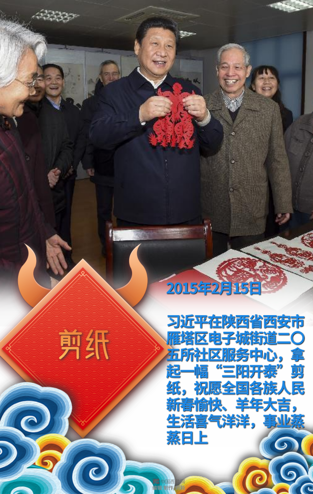 習(xí)近平在陜西省西安市雁塔區(qū)電子城街道二〇五所社區(qū)服務(wù)中心,拿起一幅“三陽(yáng)開泰”剪紙,祝愿全國(guó)各族人民新春愉快、羊年大吉,生活喜氣洋洋,事業(yè)蒸蒸日上