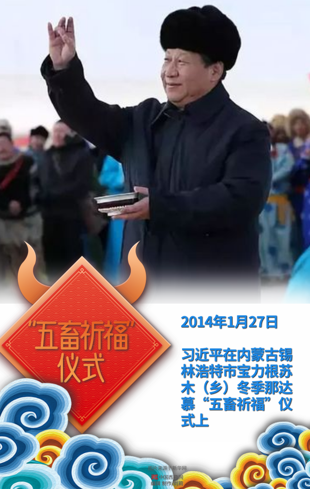習(xí)近平在內(nèi)蒙古錫林浩特市寶力根蘇木(鄉(xiāng))冬季那達(dá)慕“五畜祈?!眱x式上