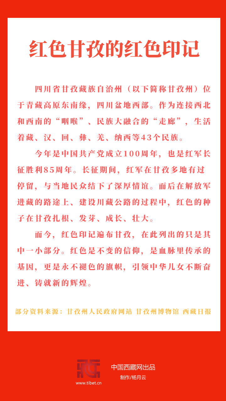 今年是中國共產(chǎn)黨成立100周年,也是紅軍長征勝利85周年。長征期間,紅軍在甘孜多地有過停留,與當?shù)孛癖娊Y下了深厚情誼。而后在解放軍進藏的路途上、建設川藏公路的過程中,紅色的種子在甘孜扎根、發(fā)芽、成長、壯大。