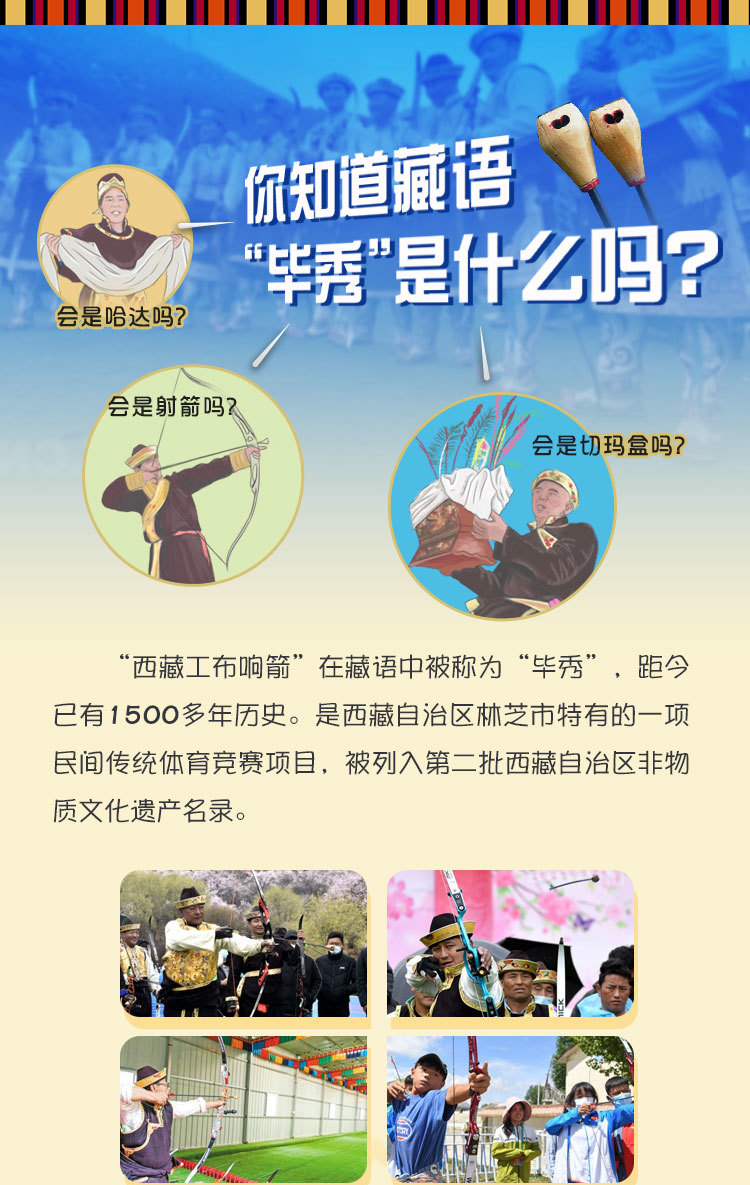 "西藏工布響箭"在藏語中被稱為“畢秀”,距今已有1500多年歷史。是西藏自治區(qū)林芝市特有的一項(xiàng)民間傳統(tǒng)體育競(jìng)賽項(xiàng)目,被列入第二批西藏自治區(qū)非物質(zhì)文化遺產(chǎn)名錄。[詳細(xì)]