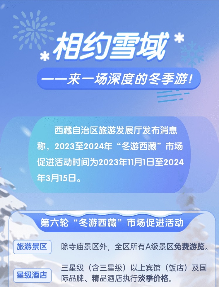 西藏自治區(qū)旅游發(fā)展廳發(fā)布消息稱(chēng),2023至2024年“冬游西藏”市場(chǎng)促進(jìn)活動(dòng)時(shí)間為2023年11月1日至2024年3月15日。[詳細(xì)]