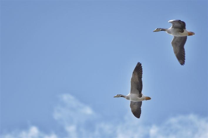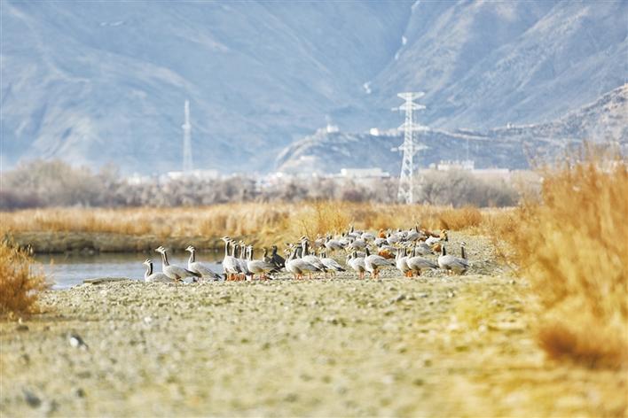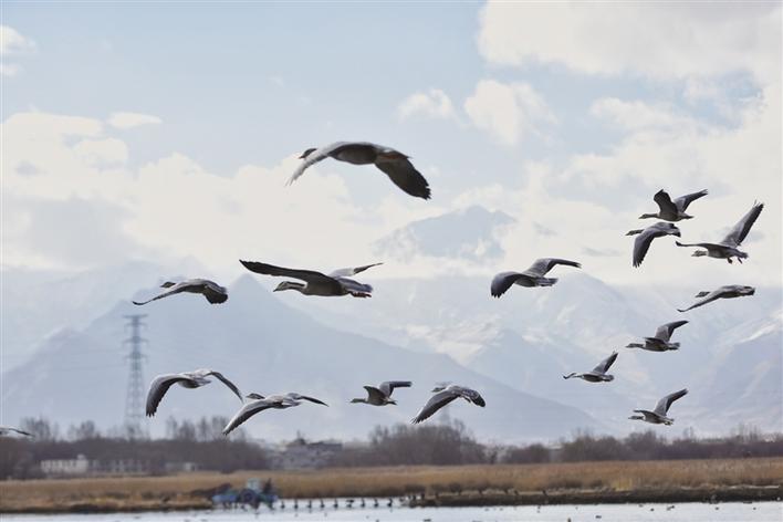 遠(yuǎn)處,連綿起伏的山頂還覆蓋著薄薄的積雪,布達(dá)拉宮雄偉而秀美;近處,濕地內(nèi)隨意顯現(xiàn)出的一塊塊水泊,成群的候鳥在水中玩耍嬉戲、在藍(lán)天白云下飛舞。見到可愛的飼養(yǎng)員帶來(lái)它們喜歡的麥粒,斑頭雁、紅隼、赤麻鴨、黃鴨等紛紛游上岸來(lái),盡情地享受美食,發(fā)出歡快的叫聲。