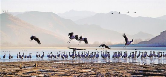圖為在林周縣保護區(qū)內(nèi)自由飛翔的黑頸鶴。 央金 攝