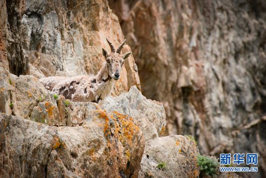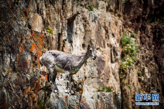 一只巖羊站在巖壁上眺望。新華網(wǎng) 宋忠勇 攝
