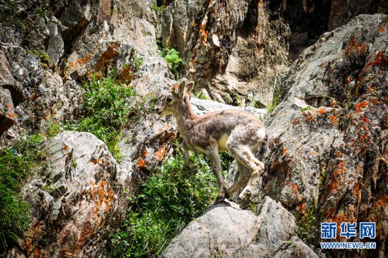 一只小巖羊在巖壁上嬉戲。新華網(wǎng) 宋忠勇 攝