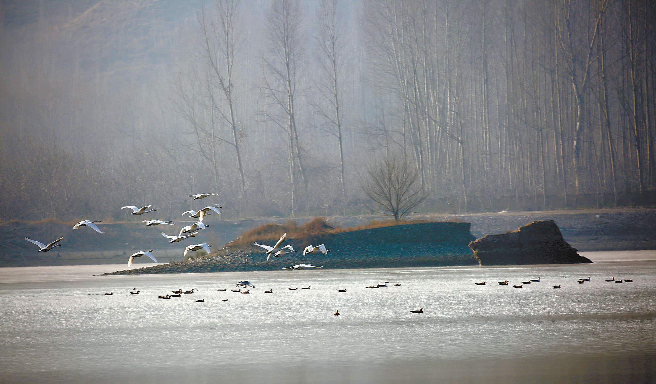 上百只大天鵝“棲息”公伯峽庫區(qū)