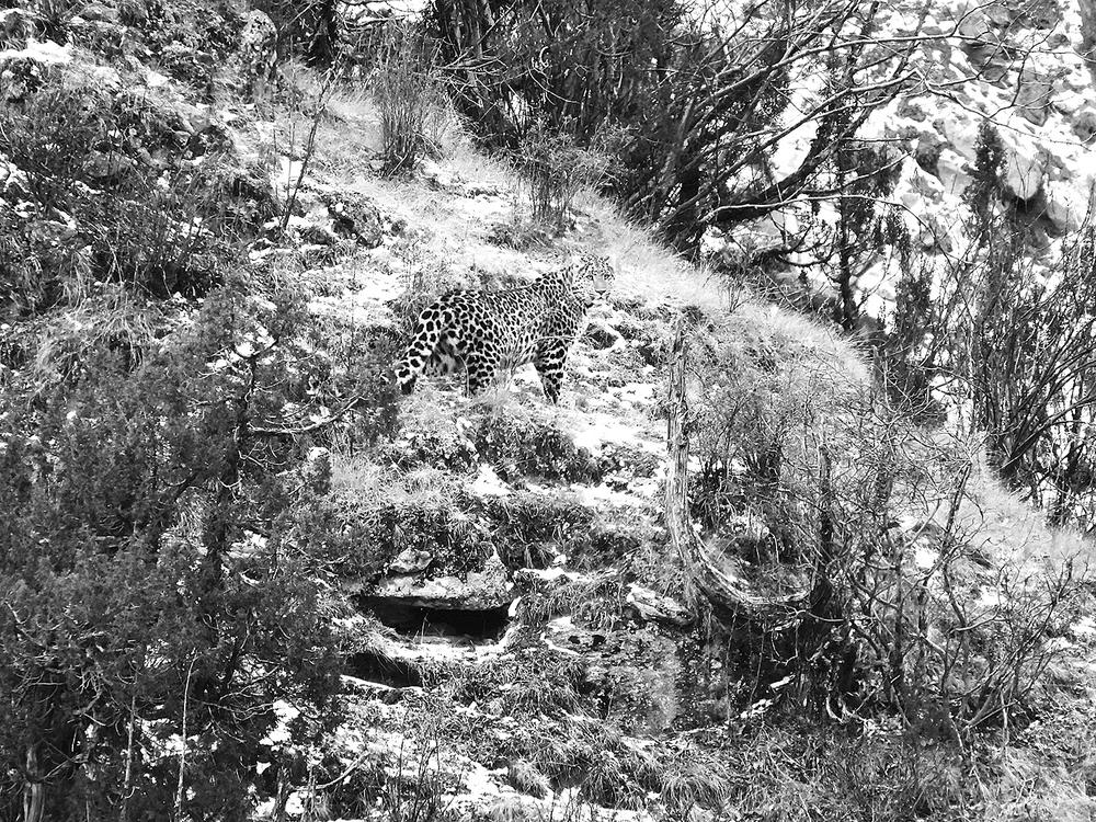 近日,在三江源國家公園瀾滄江源園區(qū)昂賽保護分區(qū)內,當?shù)匾晃荒撩窈蜕鷳B(tài)體驗者,分別拍攝到珍貴的金錢豹畫面。三江源國家公園是中國首個國家公園體制試點,包括長江源(可可西里)、黃河源、瀾滄江源三個園區(qū)在內的“一園三區(qū)”,是青藏高原生態(tài)系統(tǒng)的典型代表,分布雪豹、金錢豹、藏羚羊、黑頸鶴等珍稀物種,被稱“高原野生動物王國”“高寒生物種質資源庫”。圖為女性牧民仁青央忠拍攝的金錢豹。 仁青央忠 攝