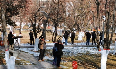 11月25日,記者來到海棠公園,從園方劉主任處了解到,太平鳥大約是一周前陸續(xù)來到海棠公園的,由最初的幾十只到現(xiàn)在的幾百只,甚至上千只,越聚越多。以前每年海棠公園也會有太平鳥光顧,但是沒有今年這么多。太平鳥每年來到海棠公園主要是來吃海棠果的,海棠公園500棵海棠樹,入冬后果實變得透紅,一串一串的紅果果,吸引了無數(shù)太平鳥到這里聚餐,成為海棠公園一道獨(dú)特的風(fēng)景。因每年這個時候都是太平鳥來海棠公園做客的時間,11月24日下午,海棠公園里早早的就聚集了二三十個等候的攝影師,其中有來自四川、甘肅、山西的,也有當(dāng)?shù)氐臄z影愛好者。他們扛著“長槍短炮”不畏嚴(yán)寒蹲守著,全力以赴抓拍著太平鳥的美麗身姿。