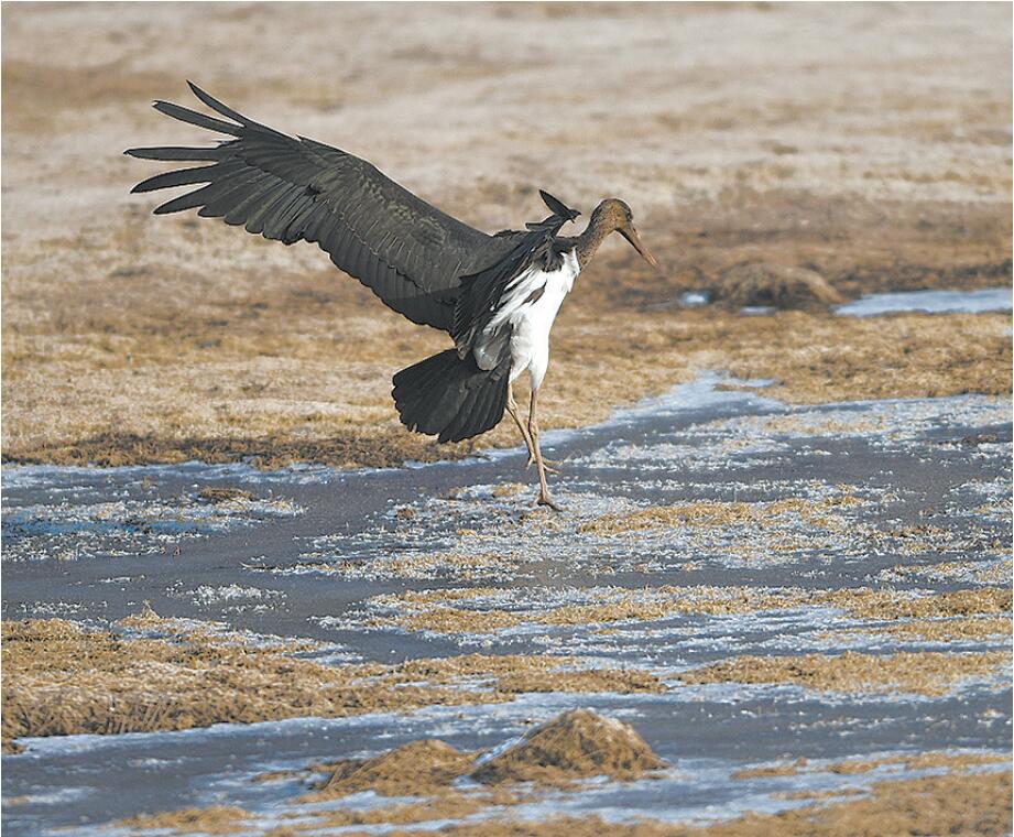 12月6日,一只黑鸛在西寧市北川河濕地公園內(nèi)嬉戲。近日,位于青海省西寧市的北川河濕地公園迎來(lái)兩只黑鸛。黑鸛屬鸛形目、鸛科,國(guó)家一級(jí)保護(hù)動(dòng)物,目前全世界僅存3000只左右,屬于國(guó)寶級(jí)珍禽。新華社記者吳剛攝