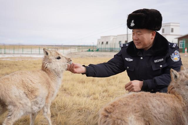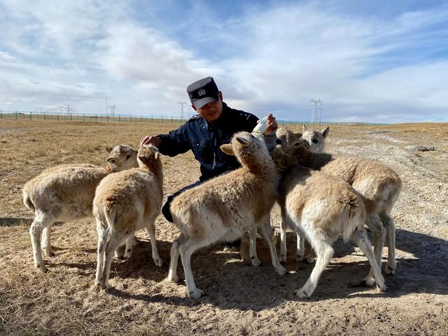 12月7日,可可西里索南達(dá)杰保護(hù)站站長(zhǎng)趙新錄在給藏羚羊幼仔喂奶。