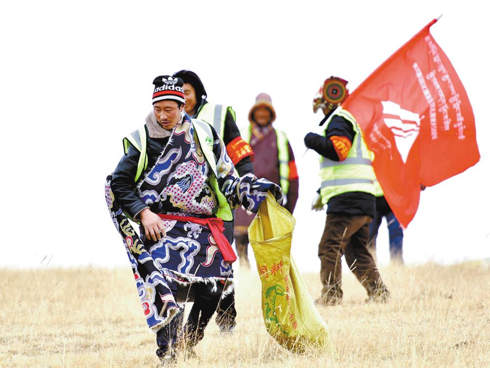 瑪多縣瑪查理鎮(zhèn)噶丹村,生態(tài)管護員索南吉(右)與才讓多杰在村子周邊的草原上撿垃圾。