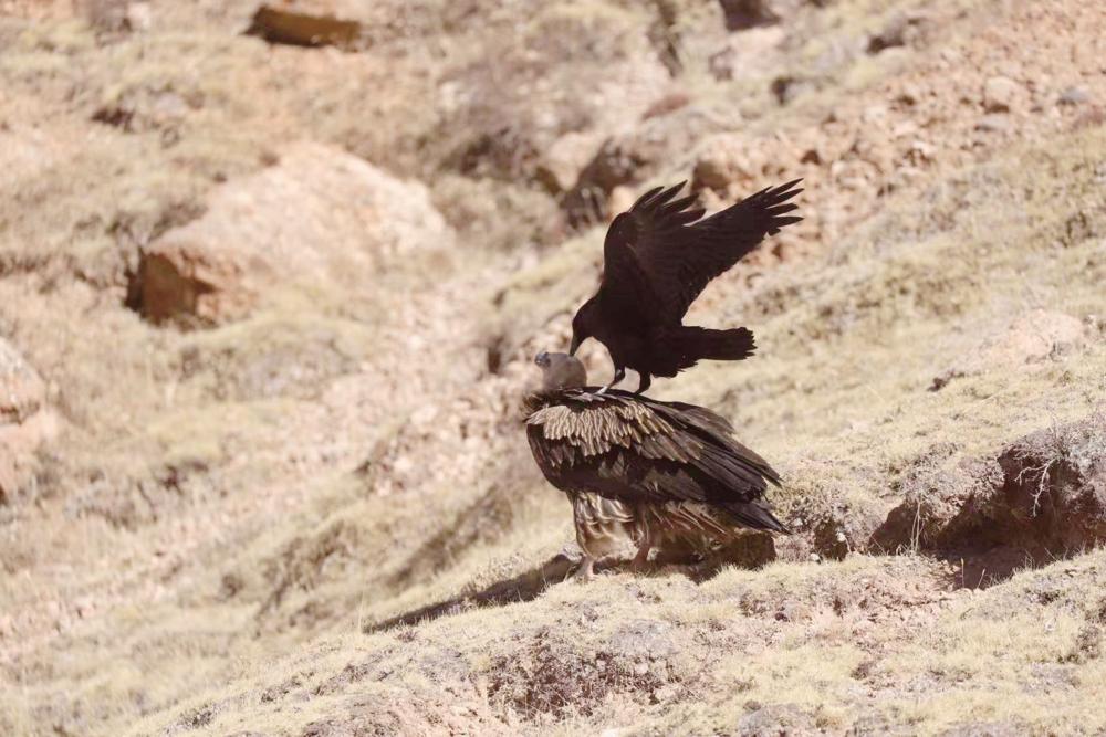 一場小型鳥類與大型猛禽之間的較量就此展開,烏鴉細(xì)長的嘴巴啄在了禿鷲的脖子上,雙腳踩向禿鷲的后背。禿鷲的身子搖晃著,差點(diǎn)倒在了山坡上,而烏鴉搖晃著身子向遠(yuǎn)處飛去。
