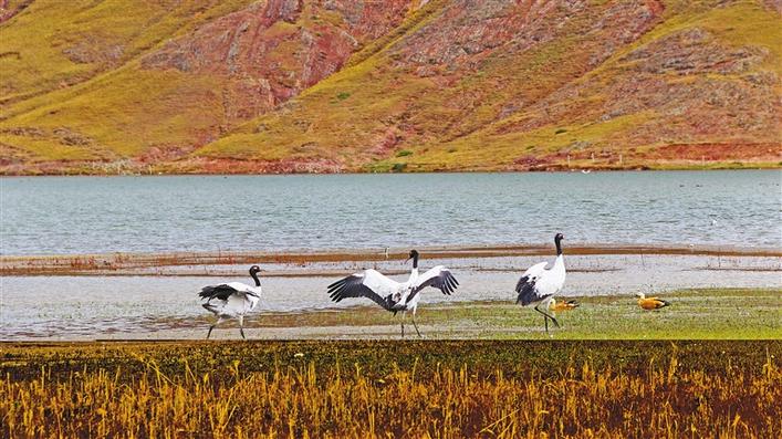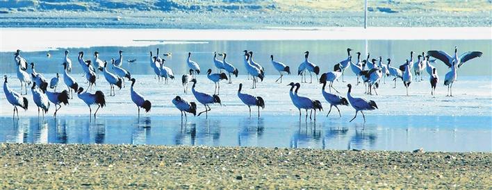 在冬日暖陽的照耀下,成群結(jié)隊(duì)的鳥兒在河面上、濕地里盡情嬉戲,赤麻鴨悠然戲水、斑頭雁低聲吟唱、黑頸鶴翩翩起舞……一派熱鬧的景象。