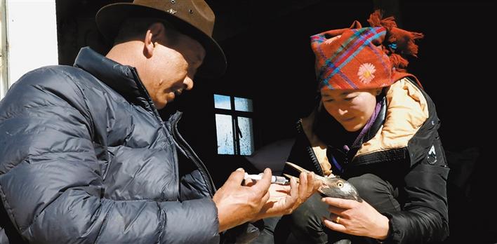 “你看,這只黑頸鶴是十幾天前我從田間救回來的,當(dāng)時(shí)它的翅膀和右腿都受了傷,奄奄一息,我還擔(dān)心救不活它。我把消炎藥放入酥油中攪拌制成膏藥,涂抹在它的傷口上,并給它喂了口服消炎藥,白天就把它放到院子里,讓它鍛煉受傷的腿腳。通過細(xì)心照料它恢復(fù)得很好,等它痊愈了,我就把它放歸大自然?!?9歲的巡護(hù)員多布杰高興地說。
