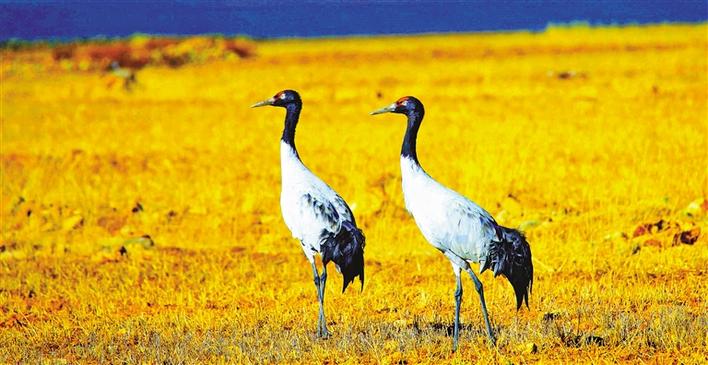 一對(duì)黑頸鶴在林周過冬。