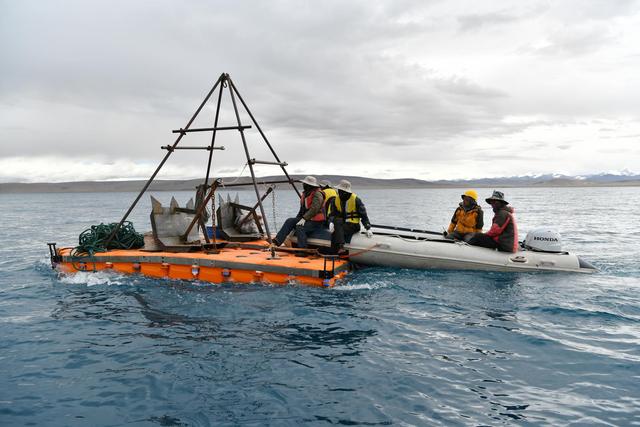 第二次青藏科考納木錯(cuò)湖泊科考團(tuán)隊(duì)利用搭建好的水上平臺(tái),計(jì)劃鉆取100米深的湖芯,分析研究納木錯(cuò)地區(qū)10到20萬(wàn)年以來古氣候的演變過程及其機(jī)理。圖為2019年7月6日,科研人員駕船推動(dòng)浮動(dòng)平臺(tái)到指定區(qū)域投放錨鏈。新華社記者 李鑫 攝