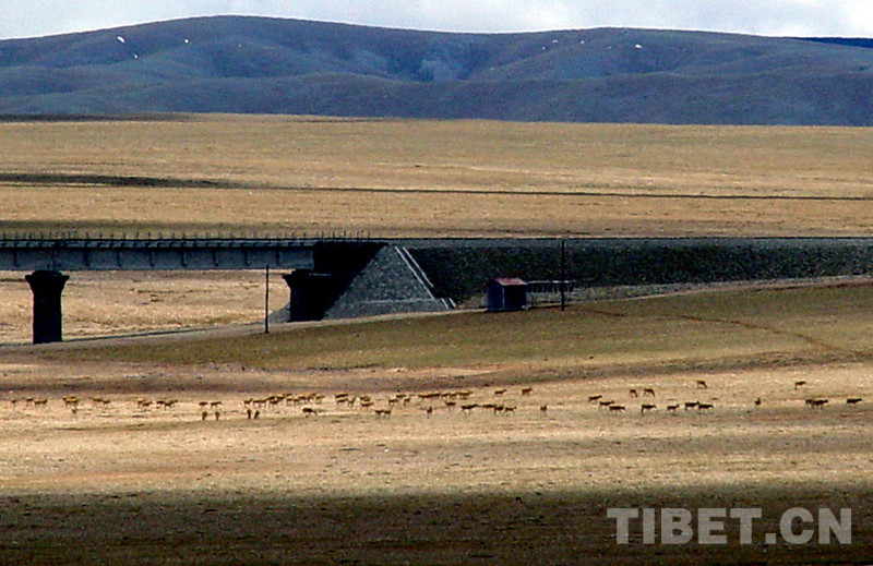 藏北高原,在藏語里稱為“羌塘”。這里棲息著的藏羚羊,每年春夏季都會(huì)大規(guī)模由南向北長距離遷徙,五道梁至楚瑪爾河一帶是必經(jīng)之路。為了保證藏羚羊自由遷徙,青藏鐵路在這里設(shè)立了四處野生動(dòng)物通道。其中長11.7公里的清水河特大橋和長4公里的楚瑪爾特大橋,采取“以橋代路”形式設(shè)計(jì)動(dòng)物通道,供野生動(dòng)物通過。