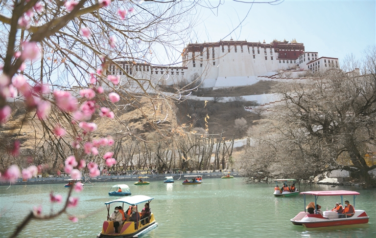 圖為3月1日,宗角祿康公園里的桃花競(jìng)相綻放,不少游客趁著春光游園賞美景。平措旺堆攝