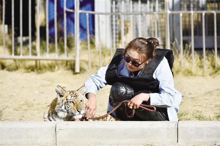 當(dāng)記者看到四只幼獅時(shí),它們時(shí)而聚在一起,時(shí)而沿著籠子邊溜達(dá),時(shí)而張開(kāi)大嘴向著外人示威,還有一個(gè)非?;钴S的在攀爬籠子。小老虎次仁卓瑪雖然沒(méi)有兄弟姐妹的陪伴,不過(guò)園區(qū)的獸醫(yī)小姐姐成了它最貼心的玩伴。每天,獸醫(yī)小姐姐都會(huì)帶著次仁卓瑪進(jìn)行戶(hù)外活動(dòng),次仁卓瑪像小朋友一樣喜歡玩皮球,喜歡追著獸醫(yī)小姐姐跑,還特別喜歡獸醫(yī)小姐姐給它按摩,經(jīng)常會(huì)撒嬌求抱抱。