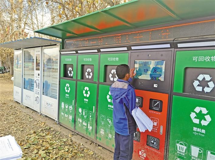 記者在林周縣城部分小區(qū)和學(xué)校內(nèi)看到,安裝的智能垃圾分類設(shè)備已全部投入使用,智能分類回收箱箱體上標(biāo)注著“紙張”“塑料”“金屬”等各類名稱。學(xué)生們只要在設(shè)備端口掃描校園班級卡上的二維碼,把廢紙、塑料瓶等垃圾依次分類放入“智能回收箱”,垃圾分類箱便會根據(jù)投放的垃圾自動稱重計算積分,并在學(xué)生的校園班級卡賬戶上增加相應(yīng)的“垃圾兌換積分”,使用積分就可以在平臺兌換作業(yè)本、紙筆等學(xué)習(xí)用品。