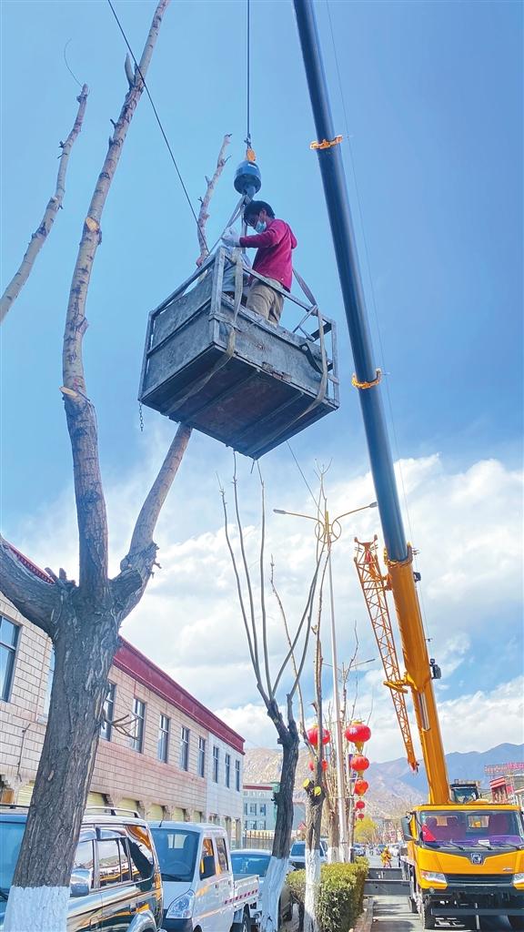 拉薩市園林相關單位對市區(qū)開展春季樹木修剪工作。