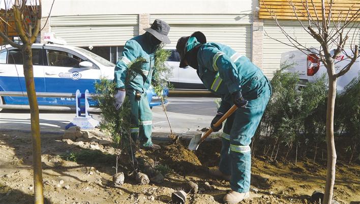 拉薩城關區(qū)潔達園林公司工作人員開展春季市區(qū)補植補栽工作。