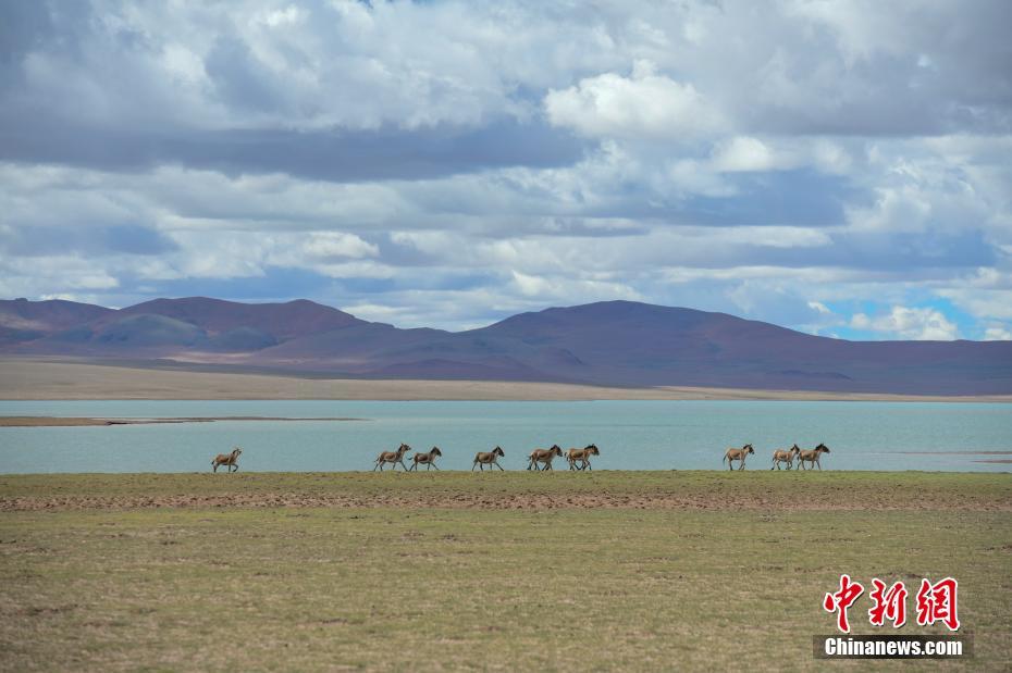 6月19日,西藏那曲羌塘草原上的藏野驢在湖邊奔騰跳躍。羌塘草原位于西藏自治區(qū)北部,平均海拔超過4600米,是目前中國海拔最高、面積最大的自然保護(hù)區(qū)。這里是野生動(dòng)物的樂園,藏羚羊、藏原羚、藏野驢等珍稀野生動(dòng)物與雪山、草地、藍(lán)天、白云,構(gòu)成撼人心魄的壯美畫面。 中新社記者 貢嘎來松 攝