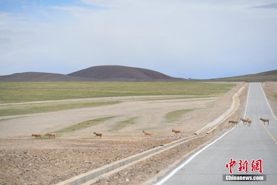 6月20日,藏羚羊群在西藏那曲雙湖縣境內(nèi)穿越公路。羌塘草原位于西藏自治區(qū)北部,平均海拔超過4600米,是目前中國海拔最高、面積最大的自然保護(hù)區(qū)。這里是野生動(dòng)物的樂園,藏羚羊、藏原羚、藏野驢等珍稀野生動(dòng)物與雪山、草地、藍(lán)天、白云,構(gòu)成撼人心魄的壯美畫面。中新社記者 貢嘎來松 攝