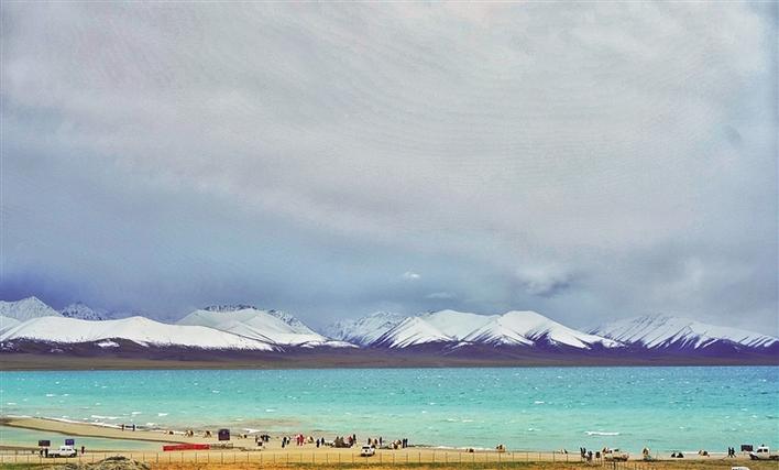 從羊八井出發(fā)至當(dāng)雄縣,有一條向左的岔路,沿著這條路一直向前開約60公里,就能到達(dá)西藏最著名的景區(qū)之一——納木措。納木措,湖面海拔4718米,形狀近似長(zhǎng)方形,東西長(zhǎng)70多千米,南北寬30多千米,湖的東南部是直插云宵、終年積雪的念青唐古拉山主峰,清澈的湖水便來(lái)自念青唐古拉山融化的冰雪,北側(cè)則倚偎著和緩連綿的高原丘陵,廣闊的草原繞湖四周,似是將納木措小心翼翼地護(hù)在懷中。湖水顏色由罕見的碧藍(lán)與碧綠色相結(jié)合,是畫師都不易調(diào)出的顏色,遠(yuǎn)遠(yuǎn)望去,碧波粼粼的湖水與周圍的山脈、草原、藍(lán)天、白云交相輝映,令在場(chǎng)的人不禁連連感嘆仿佛置身于仙境之中。