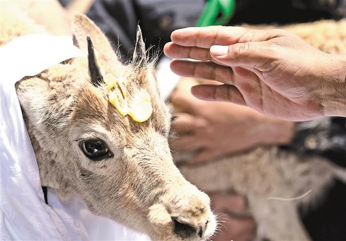 圖為7月7日,在可可西里索南達(dá)杰保護(hù)站野生動(dòng)物救助中心,可可西里巡山隊(duì)員按照風(fēng)俗,在藏羚羊額頭上涂抹酥油表達(dá)祝福。新華社記者 張龍 攝