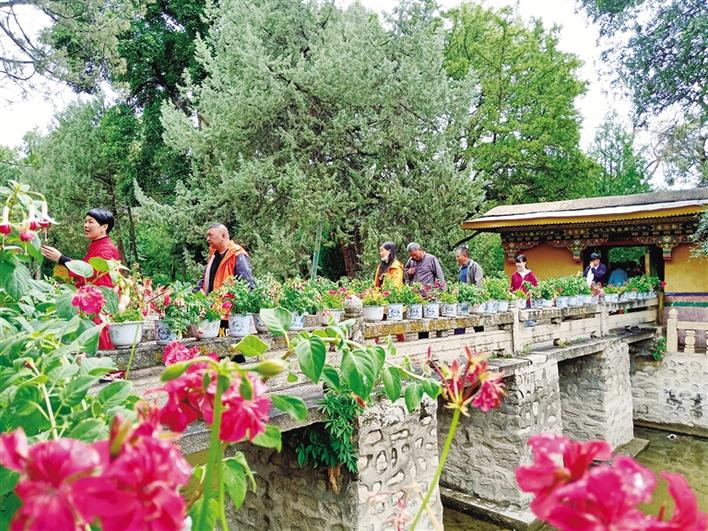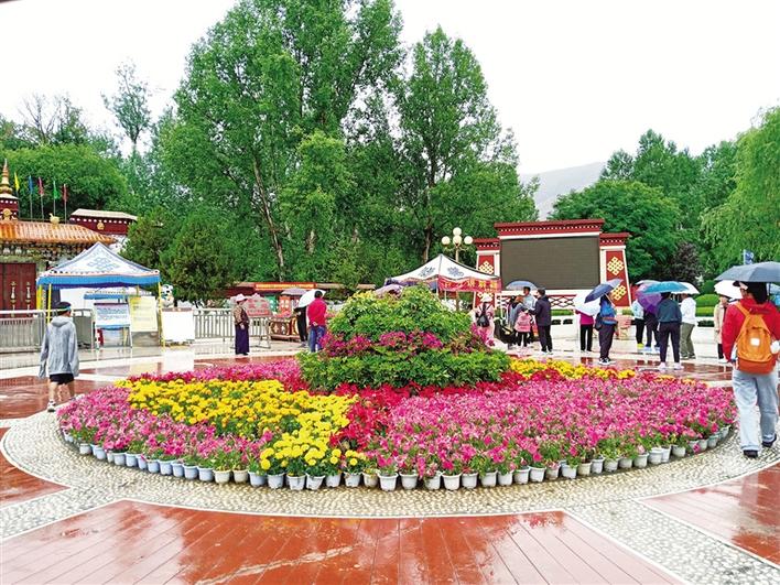 在羅布林卡廣場(chǎng),擺放的花卉吸引人們拍照打卡留念。走進(jìn)園內(nèi),一陣清涼感迎面撲來(lái),雨后的羅布林卡空氣濕潤(rùn),除了花草的香味還可以聞到一絲泥土的氣息。充沛的雨水讓園內(nèi)的樹木更加蔥郁、花朵更加?jì)善G。作為每年盛夏時(shí)期拉薩市區(qū)內(nèi)最佳的避暑去處,羅布林卡吸引著本地市民群眾、區(qū)外游客紛至沓來(lái)。