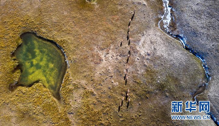 2019年10月19日,藏野驢在三江源地區(qū)活動(dòng)(無人機(jī)照片) 新華社記者 吳剛 攝