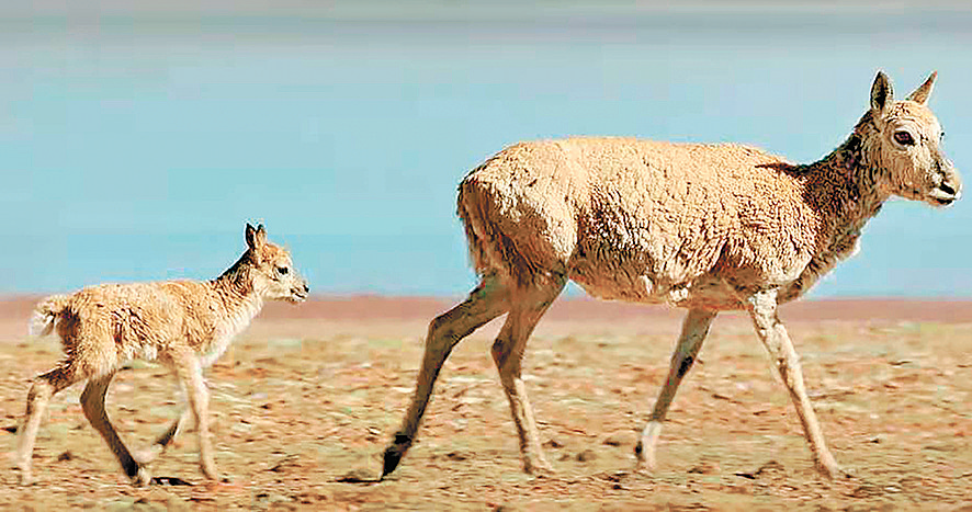 母藏羚羊帶著幼羔回歸棲息地。