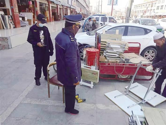 執(zhí)法人員對(duì)占道經(jīng)營(yíng)商戶進(jìn)行勸說。圖由城關(guān)區(qū)城管局提供