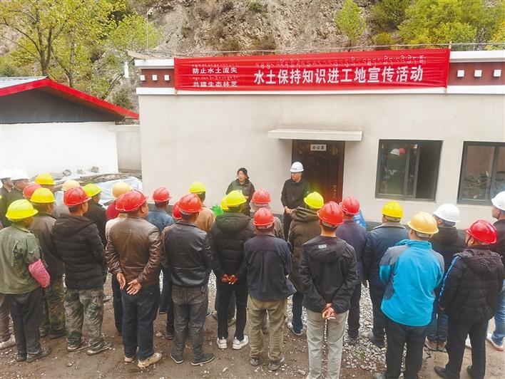 林芝市水利局工作人員在朗縣拉多鄉(xiāng)項目工地向一線工人和管理人員宣傳水土保持知識