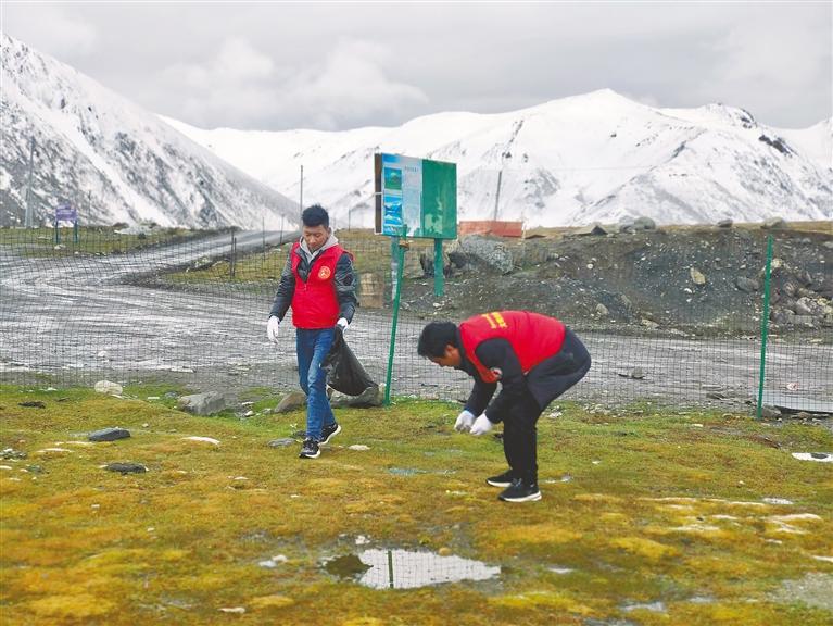圖為該支部黨員在薩普雪山風景區(qū)撿拾垃圾。記者 萬靖 攝