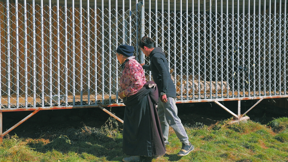 “在巖壁下發(fā)現(xiàn)了它,因?yàn)榱餮^(guò)多已經(jīng)奄奄一息了。它的一個(gè)前肢斷了,現(xiàn)在走路還是一瘸一拐的。”同為護(hù)林員的根呷介紹,當(dāng)時(shí)這只雪豹在同另外一只雪豹搶食落敗后受傷,因?yàn)檎孢_(dá)鄉(xiāng)尚未建立動(dòng)物救助中心,雪豹便寄養(yǎng)在甲它家中。鄉(xiāng)政府出資修建了雪豹居住的“鐵籠”,甲它負(fù)責(zé)給它喂食,甲它的妻子則每隔一段時(shí)間就要為這頭猛獸打掃一次圈舍。