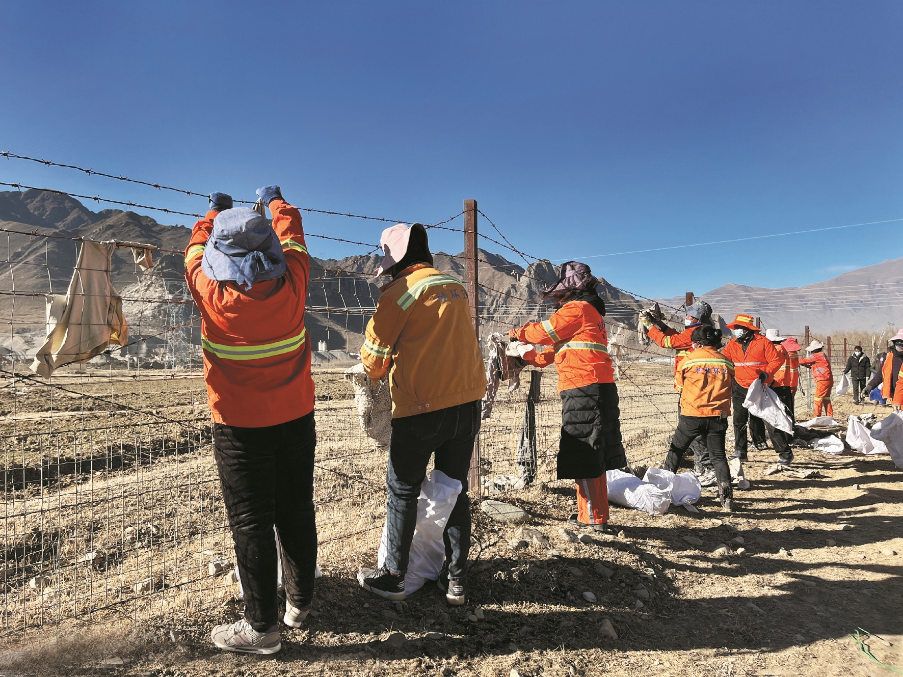圖為柳梧街道鄉(xiāng)村保潔隊正在清理農(nóng)田網(wǎng)欄上的舊衣服。拉薩融媒記者 旦 達攝