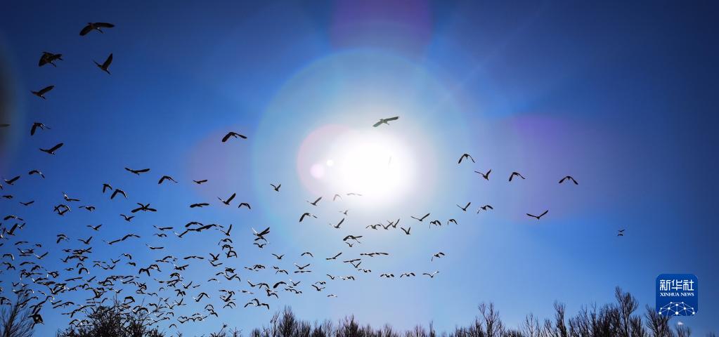 候鳥飛過唐嘎濕地(12月11日攝,手機照片)。新華社記者 沈虹冰 攝