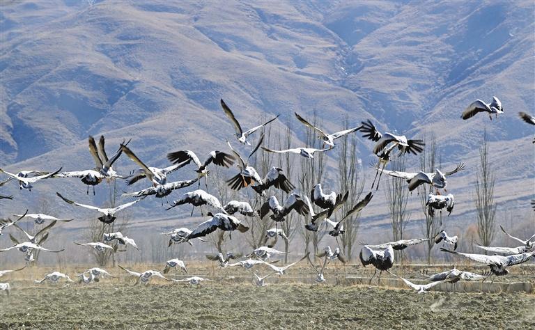 冬日的山南,又一次迎來了一群特殊的客人——黑頸鶴。成群的黑頸鶴在田野悠閑地覓食、嬉戲,給冬季增添了生機(jī)和活力,呈現(xiàn)出一幅人與自然和諧相處的絕美畫卷?! ?/p>